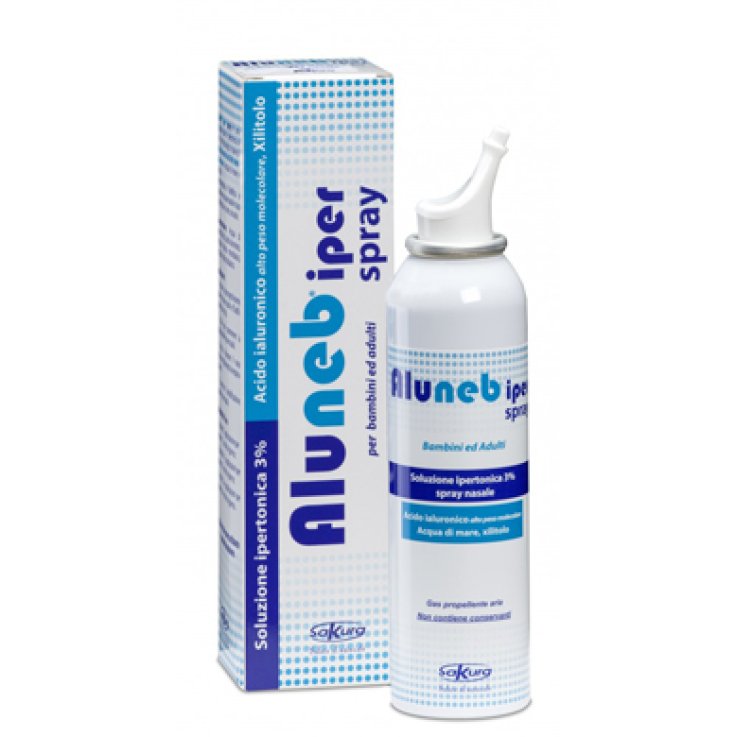 Aluneb iper spray è una soluzione ipertonica di acqua di mare (3% NaCl) ricca di sali minerali e oligoelementi con acido ialuronico ad alto peso molecolare e xilitolo.