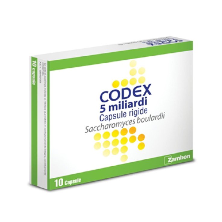 AvvertenzeNon mescolare Codex con liquidi troppo caldi o con soluzioni alcooliche. In considerazione della natura fungina di Saccharomyces boulardii, Codex non deve essere somministrato durante la terapia antifungina topica o sistemica. Informazioni generali: - Il trattamento della diarrea non è sostitutivo della reidratazione, quando necessaria. L’entità della reidratazione e la sua via di somministrazione devono essere commisurate alla gravità della diarrea e all’età ed allo stato di salute del paziente. - Si sono verificati rari casi di fungemia (e emocolture positive per i ceppi di Saccharomyces) per la maggior parte in pazienti con catetere venoso centrale, pazienti in condizioni critiche o immunocompromessi, risultanti nella maggior parte dei casi in piressia. Nella maggioranza dei casi l’esito è stato soddisfacente dopo l’interruzione del trattamento con Saccharomyces boulardii, la somministrazione di un trattamento antimicotico e la rimozione del catetere, laddove necessario. Tuttavia, l'esito è stato fatale in alcuni pazienti in condizioni critiche (vedere paragrafo 4.3 e 4.8). - Come per tutti i farmaci a base di microorganismi vivi, è necessario prestare particolare attenzione durante la manipolazione del prodotto, principalmente in presenza di pazienti con catetere venoso centrale, ma anche in presenza di pazienti con catetere venoso periferico, anche se non trattati con Saccharomyces boulardii, al fine di evitare la contaminazione da contatto e/o la diffusione dei microorganismi per via aerea (vedere paragrafo 4.2). Informazioni importanti su alcuni eccipienti. CODEX 5 miliardi capsule rigide: - contiene lattosio. I pazienti affetti da rari problemi ereditari di intolleranza al galattosio, da deficit totale di lattasi, o da malassorbimento di glucosio-galattosio, non devono assumere questo medicinale; - non contiene glutine.